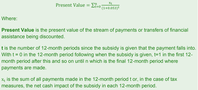 If it is considered appropriate to apply a discount rate, a public authority must use the discount rate specified in regulation 4(5) of the Gross Cash Regulations. This rate is currently 5.3% per annum, but will be updated annually. Any instalment of the subsidy paid within the first 12 months should not be discounted, and future instalments (such as monthly instalments) can be discounted in 12-month blocks rather than each having to be discounted separately. Importantly, the discounting exercise is undertaken before the GCA or GCE of the subsidy is determined. An equivalent discounting exercise must also be applied to the market rate equivalent in order to ensure that the GCA or GCE is calculated accurately.